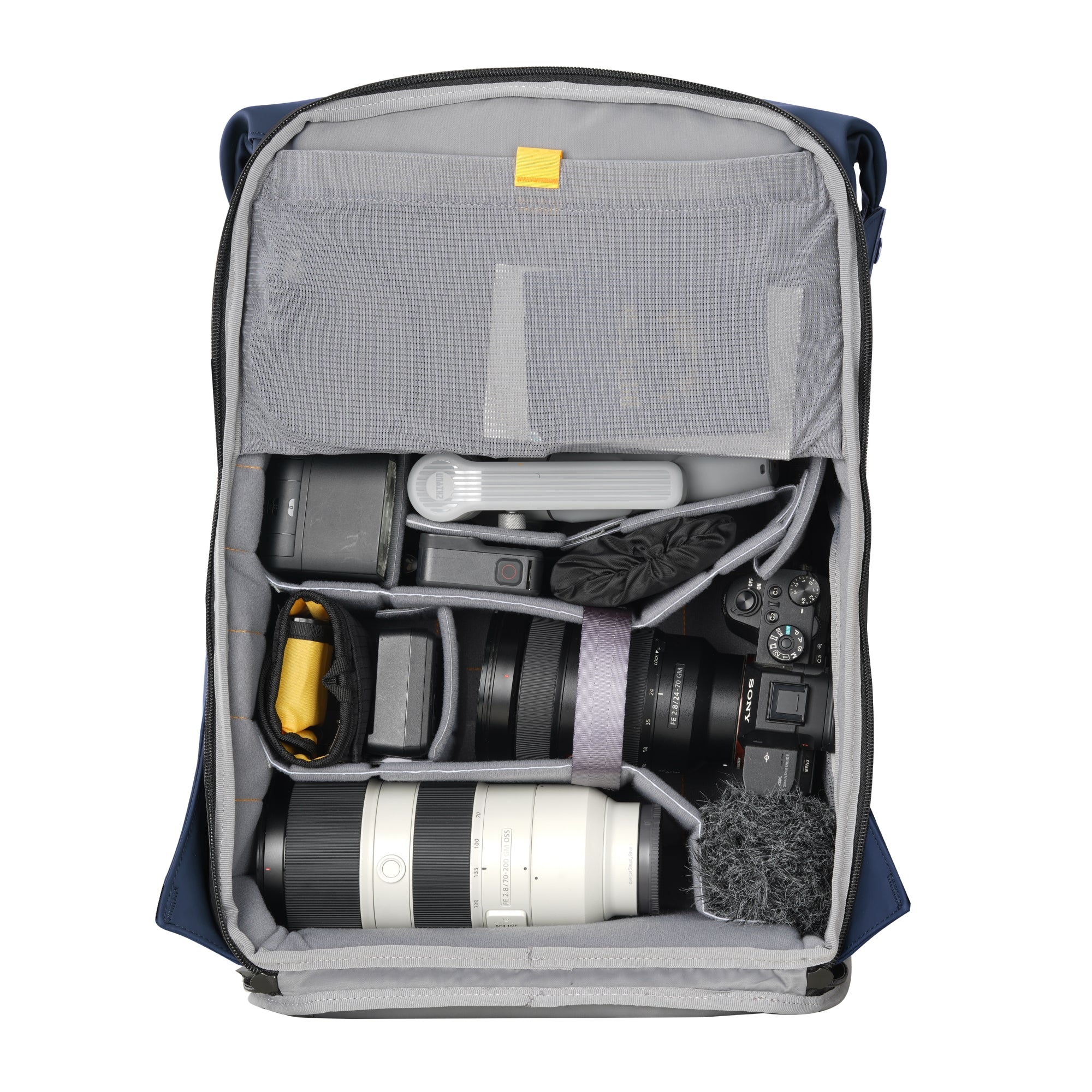 その内部には、撮影機材をしっかりと保護できる収納力と柔軟な構造を備え、使い勝手にも優れています。