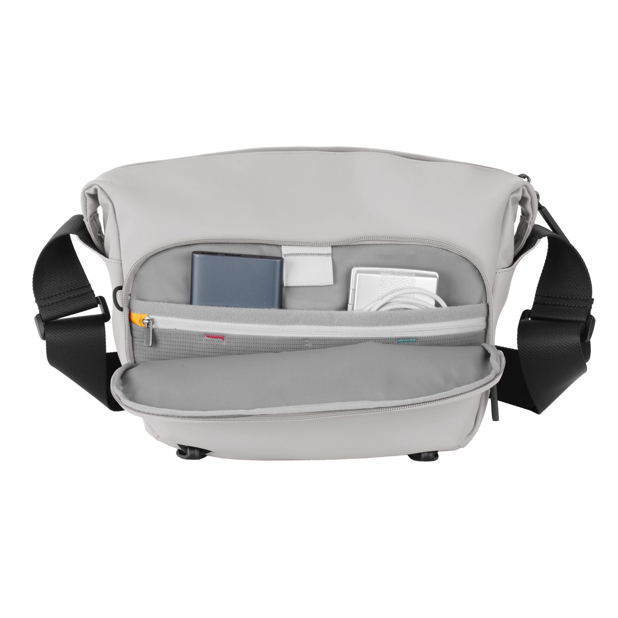 VEO LITEショルダーバッグの内側には、モバイルバッテリーから充電ケーブルを通せる専用スリットを搭載。