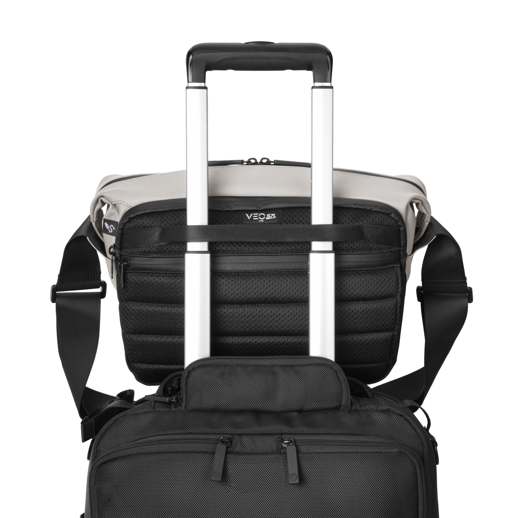 VEO LITE S7Lには、スーツケースのハンドルに通して固定できる背面スリーブを装備しています。