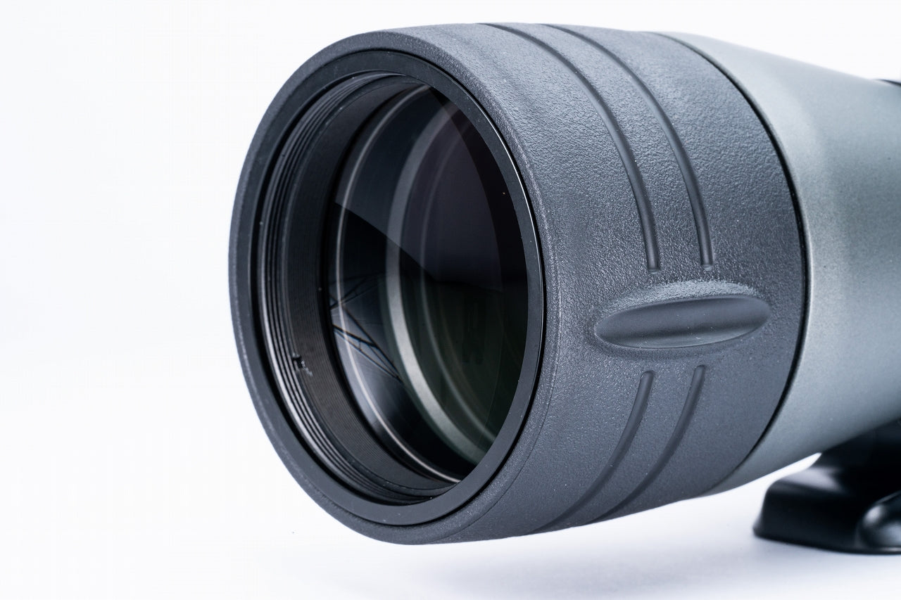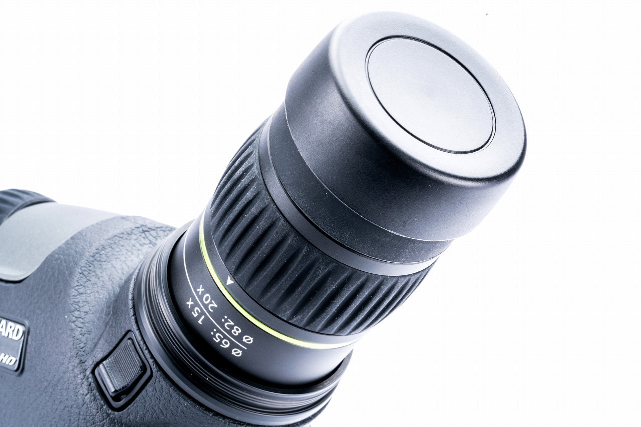 65Aは、15~45倍のズームアイピースが付属しています。伸縮調整可能なアイカップにより、ズーム時も最適なアイレリーフを確保できます。ピント調整は素早いピント合わせ用、微調整用と2種類のリングを搭載しています。また直射日光を制限するためのレンズフード、携帯・保護用のケースが付属しています。