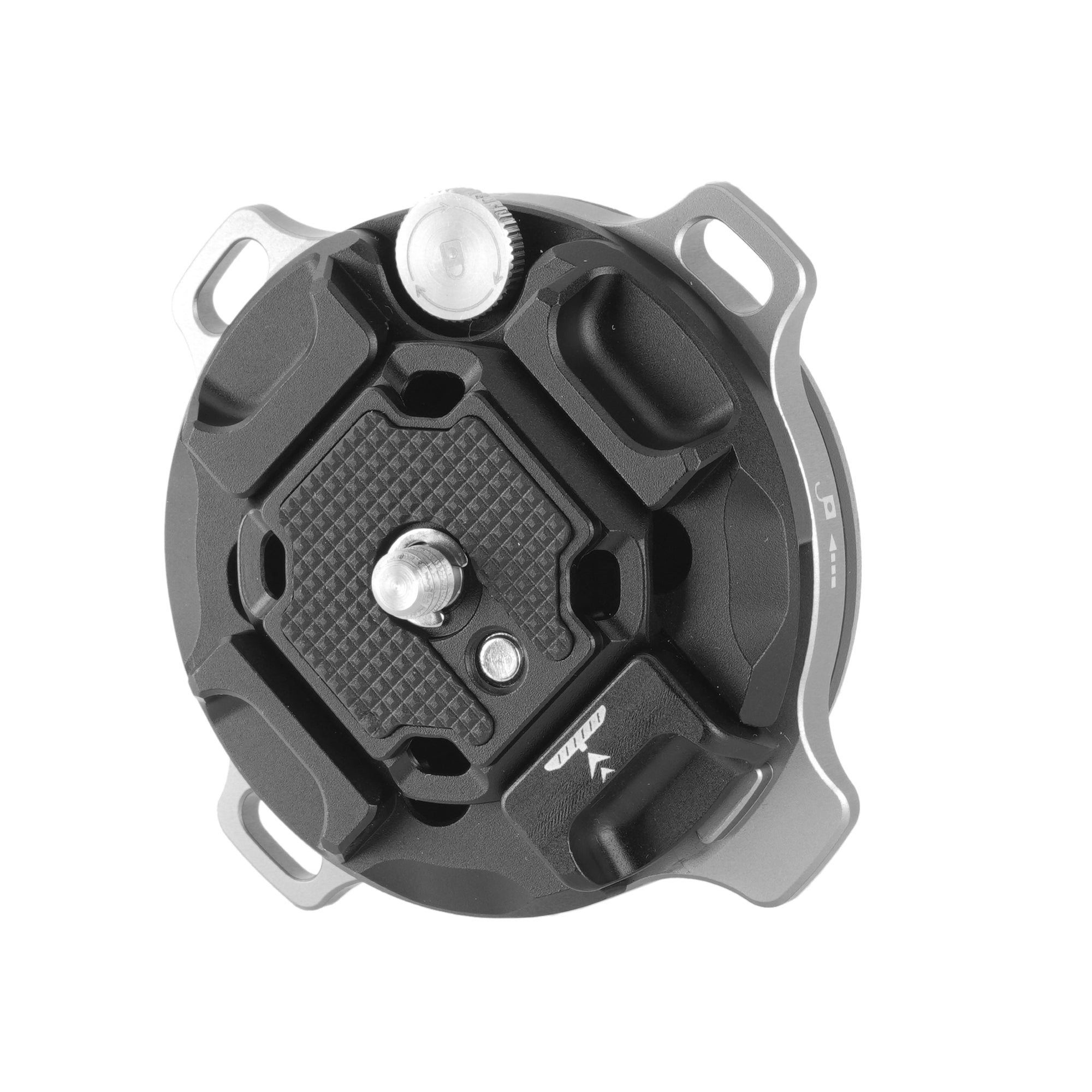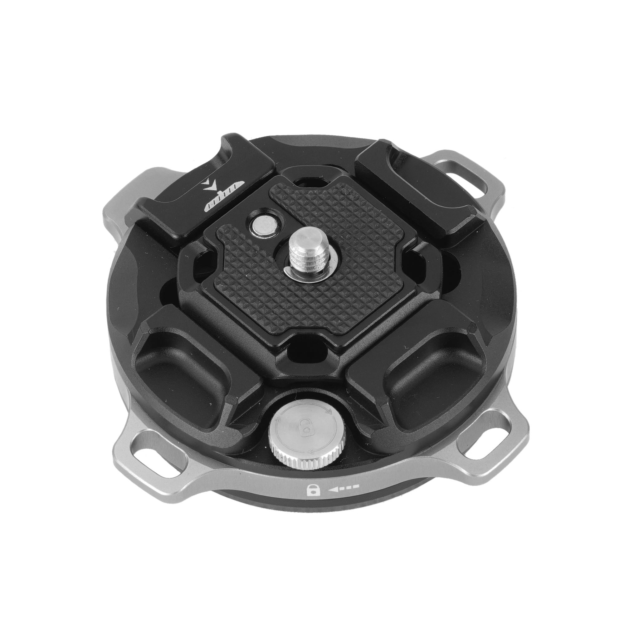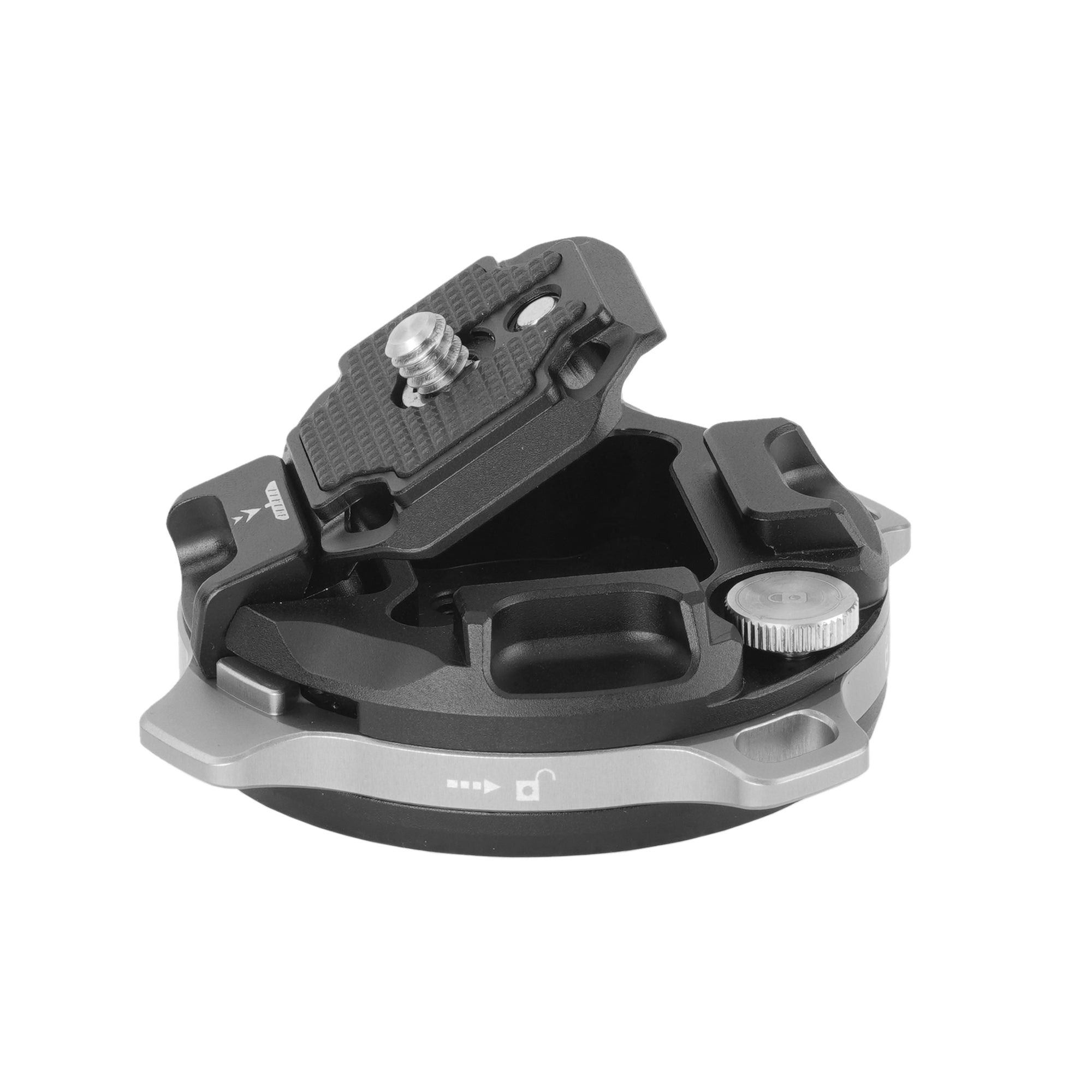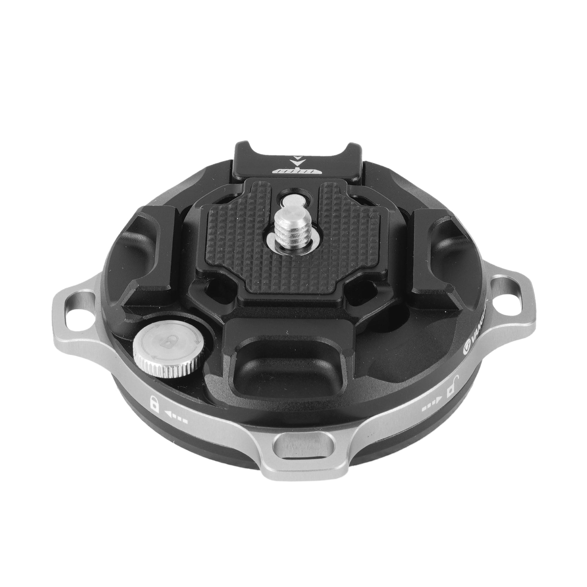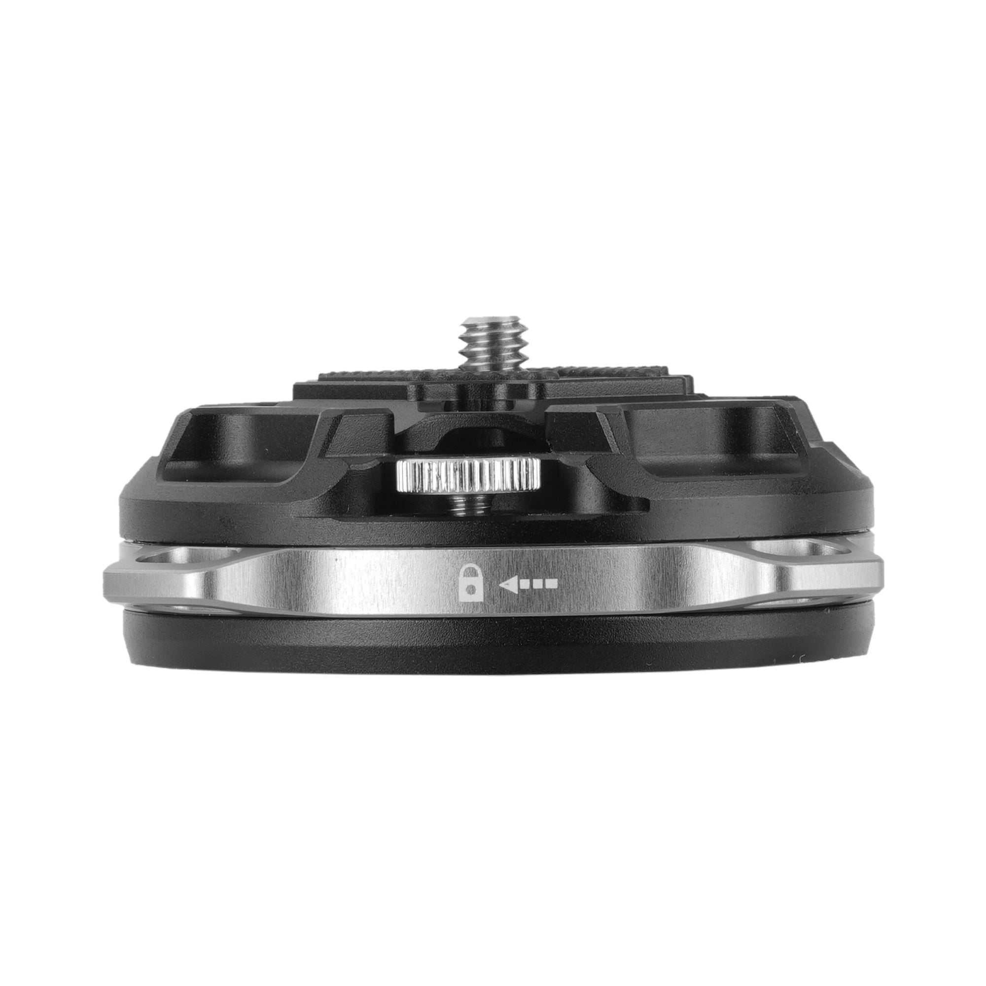 A. 押し込むだけで自動ロックし、ロックリング操作で確実に固定・解除できます。 アンチローテーション構造や固定用スクリューにより、撮影中のズレを抑えます。