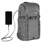 VEO ADAPTOR S46 GYバックパックは、1~2台のデジタル一眼レフ/ミラーレス、4〜5レンズ(70-200mm)、フラッシュ1台、アクセサリー類等を収納することができます。外部USB充電開口部があり、外出先でもあらゆる電子機器の充電が可能です。