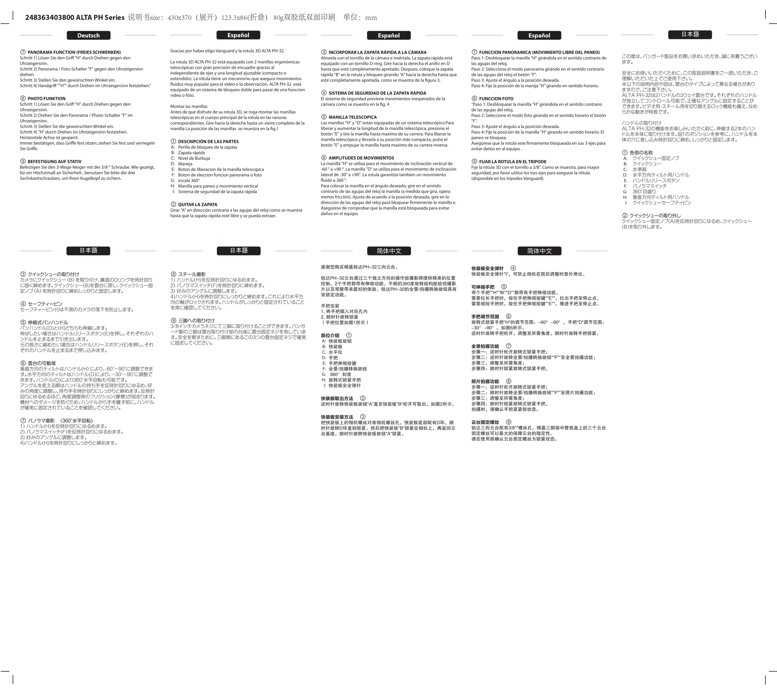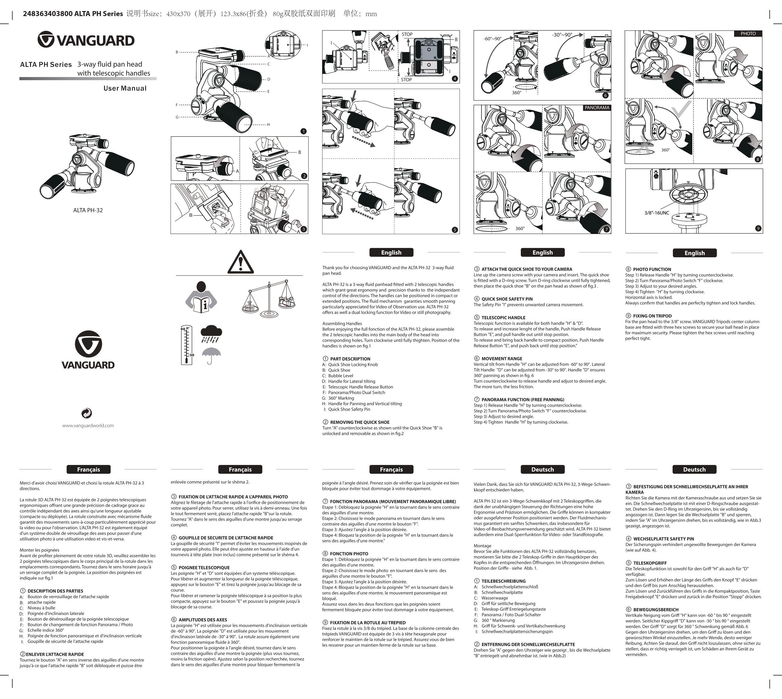 ALTA PH-32:なめらかな動きの3ウェイ雲台で、耐荷重は5kgながら重さはわずか0.68kg。2本のハンドルが独立して動き、正確にアングルを決めることが可能。片方のハンドルは360°の水平回転と-30°~+90°まで前後にティルトし、もう片方は縦方向に-60°~+90°までの可動域でポートレートや縦位置での風景撮影に最適です。動画撮影やスコープを載せての観察にも使用可能な滑らかなパンが特長。ハンドルの長さはお好みで伸縮します。