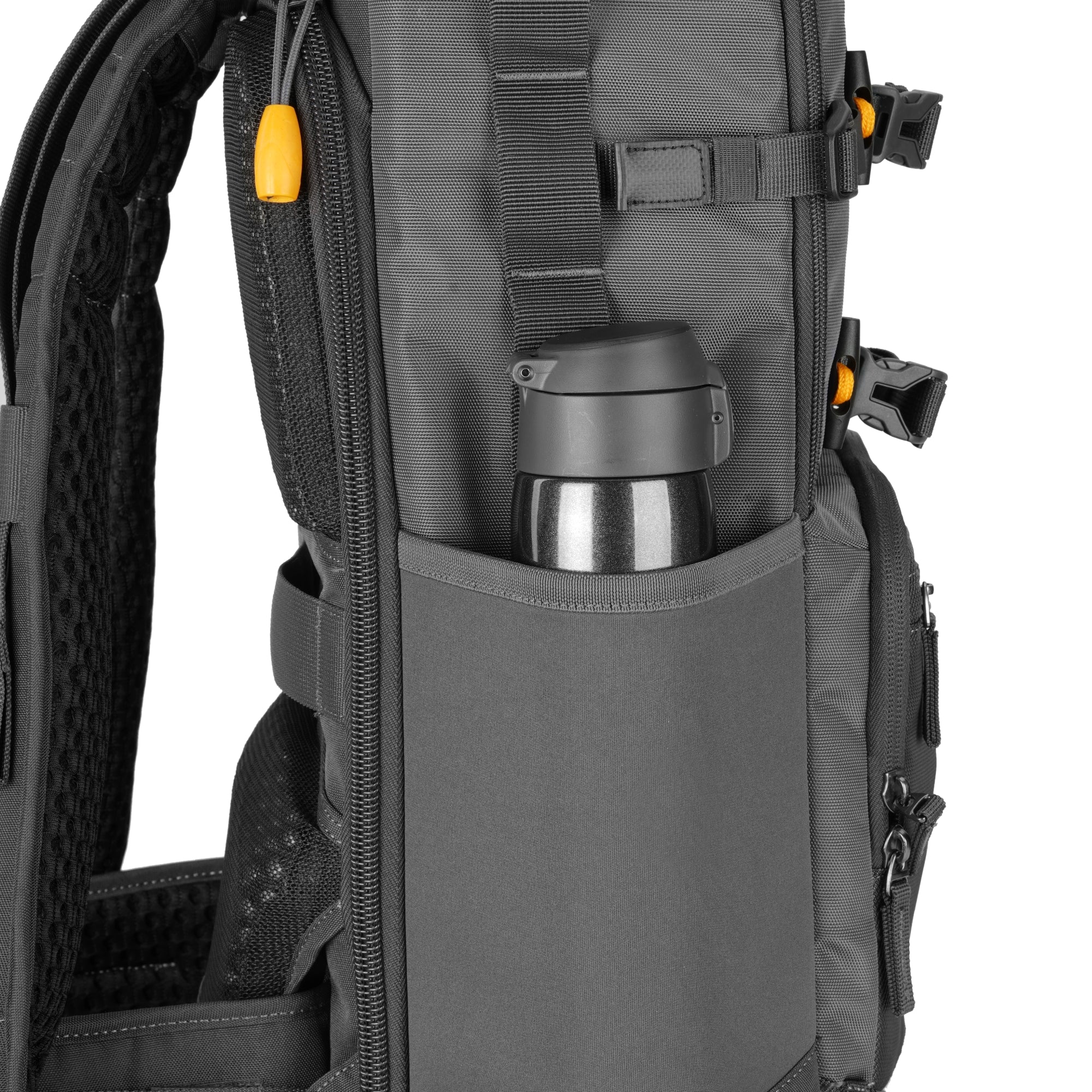 背面にはPCスリーブを備え、16インチPCの収納に対応します(※タブレット専用スリーブはありません)。 前面にはアクセサリーポケットを備えており、バッテリーやフィルター、メモリーカードなど小物の整理に便利です。 両サイドにはポケットを配置しているため、三脚の収納はもちろん、ペットボトルや水筒なども持ち運べます。 さらにバッグ上部にも小物用ポケットがあり、よく使うアイテムをサッと取り出せます。