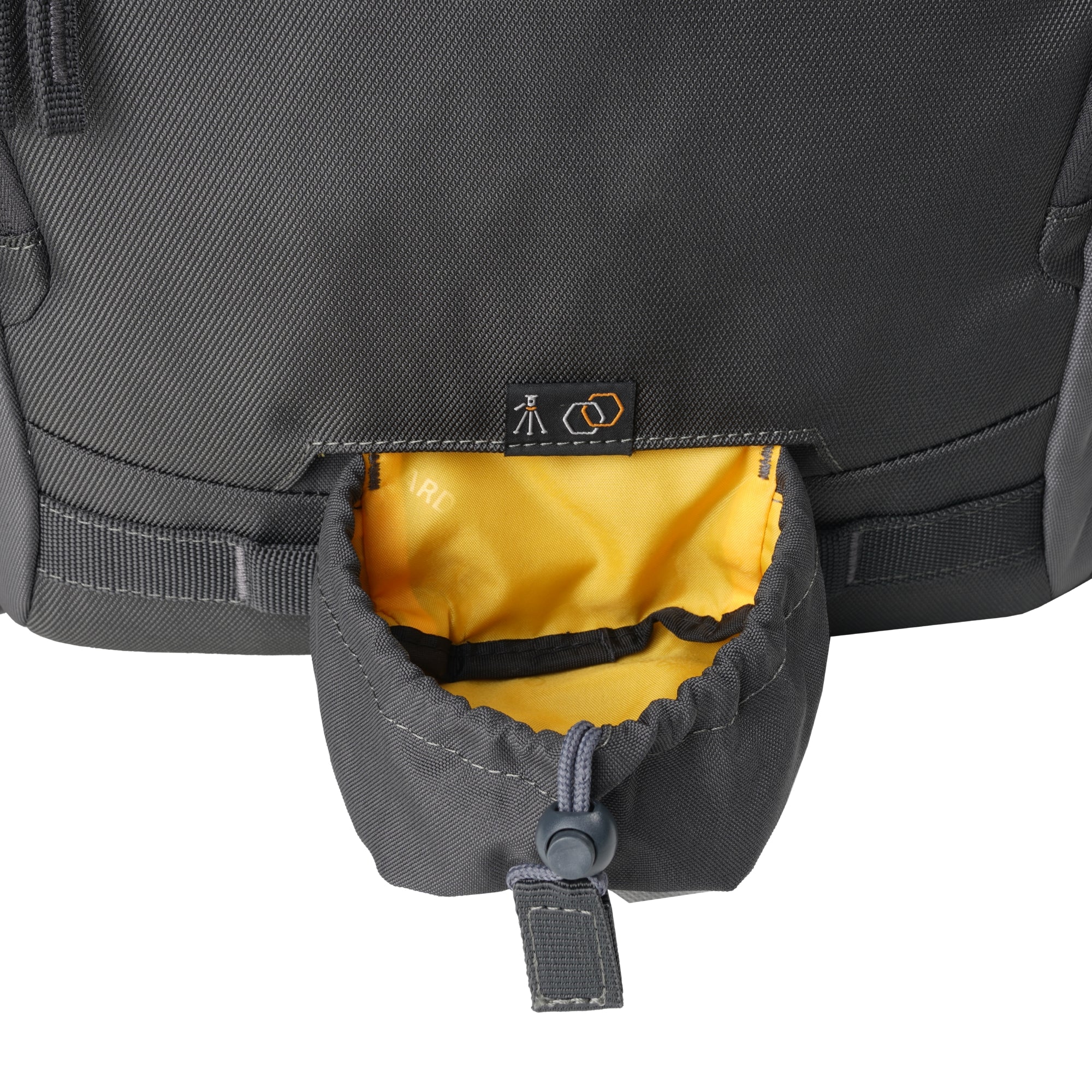 - A. バッグ前面の中央にしっかり固定できます。下部には三脚の足を支える専用ポケットもあり、バランスよく安全に持ち運べます。