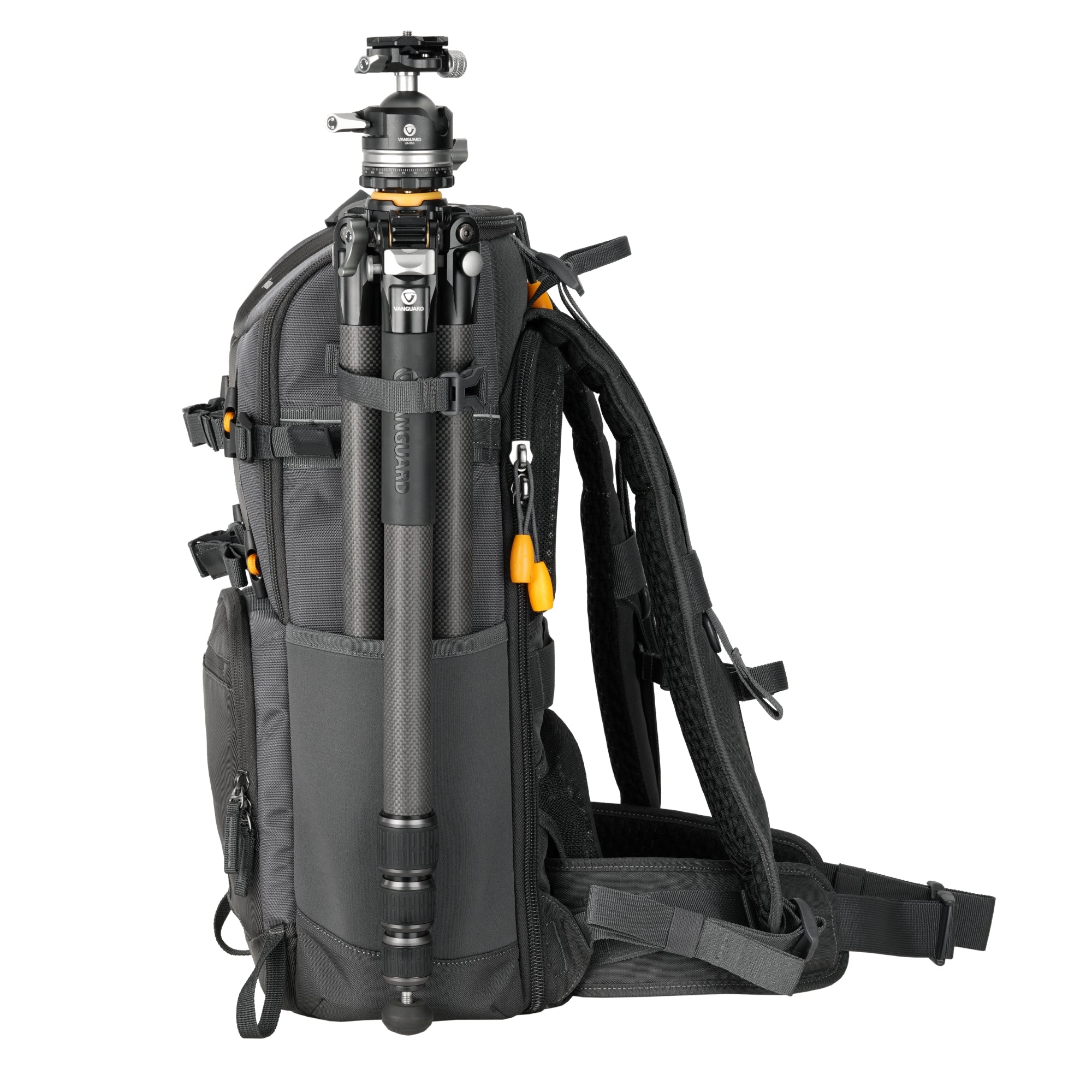 三脚はバッグ前面の中央に固定でき、バランス良く携行可能。下部には脚を支えるための専用ポケットも備え、移動時の安定性を高めます。