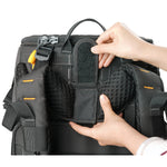 撮影スタイルに応じて100%機材収納にも、パーソナル収納にも切り替え可能な自由設計。仕切りパッドは厚手で衝撃を吸収しつつ、自由に配置できるため、 大型レンズや繊細なアクセサリー類も安全に整理できます。背面には16インチノートパソコンを収納できる専用スリーブを備えており、また、前面には11インチタブレットが収納できるスリープやメモリーなど、 周辺機器が収納できるスペースがあり、現地での編集やデータ管理もスムーズに対応可能です。