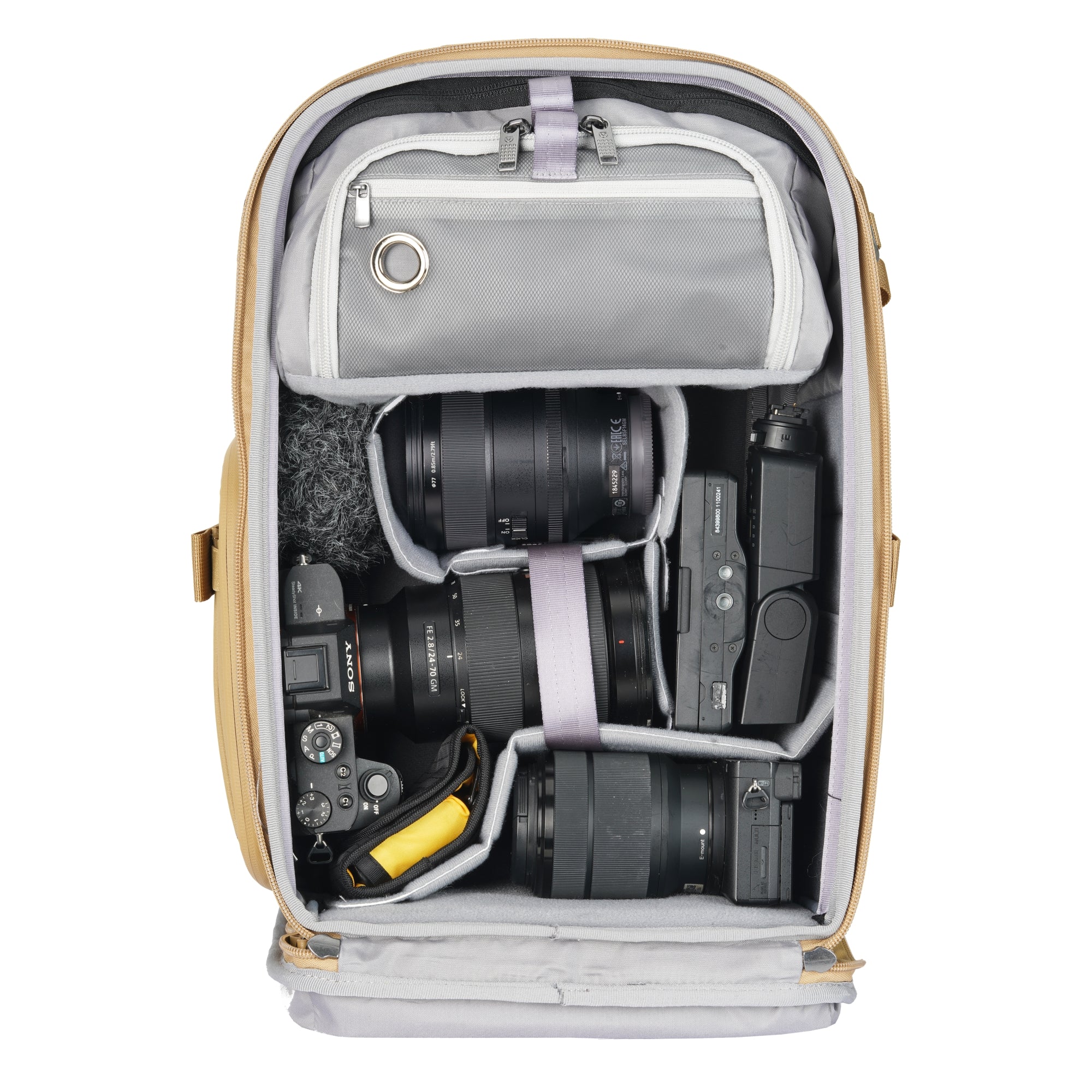 取り外し可能なデイパックセクションを搭載し、収納スペースを自在に カスタマイズできます。付属の5個の仕切りパッドでカメラやレンズ、 アクセサリーをすっきり整理整頓。20Lというコンパクトながら十分な 容量を確保しており、カメラ機材からPC、タブレットまでまとめて 持ち運べるのが魅力です。
