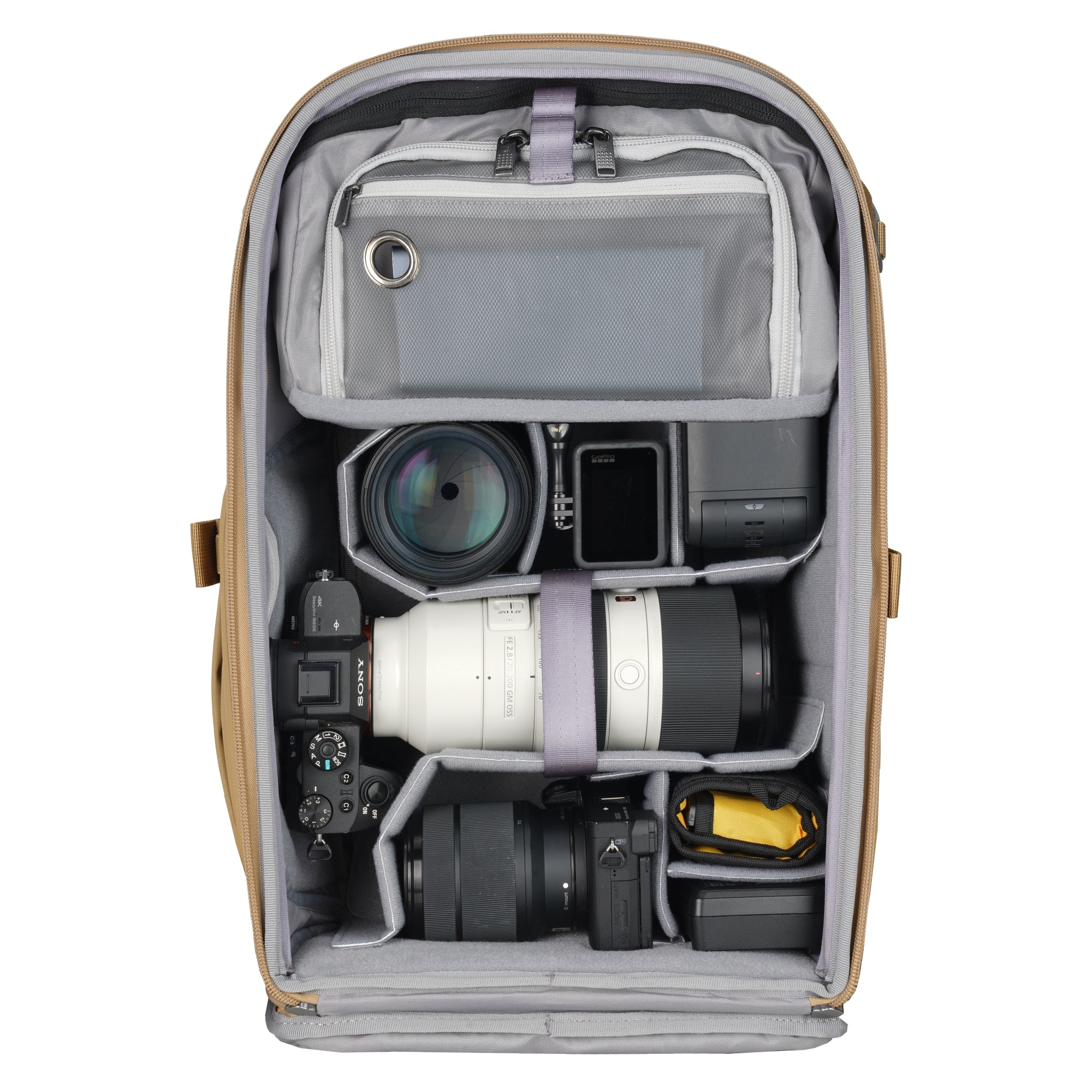 取り外し可能なデイパックセクションを備え、用途に合わせて収納スペースを 柔軟に変更できます。付属の7個の仕切りパッドを自由にレイアウトすれば、 カメラやレンズ、アクセサリーを整理しやすくなります。さらに、25Lの 大容量設計で、カメラはもちろんPCやタブレットも効率的に収納できる ため、作業や撮影のワークフローがスムーズに進みます。