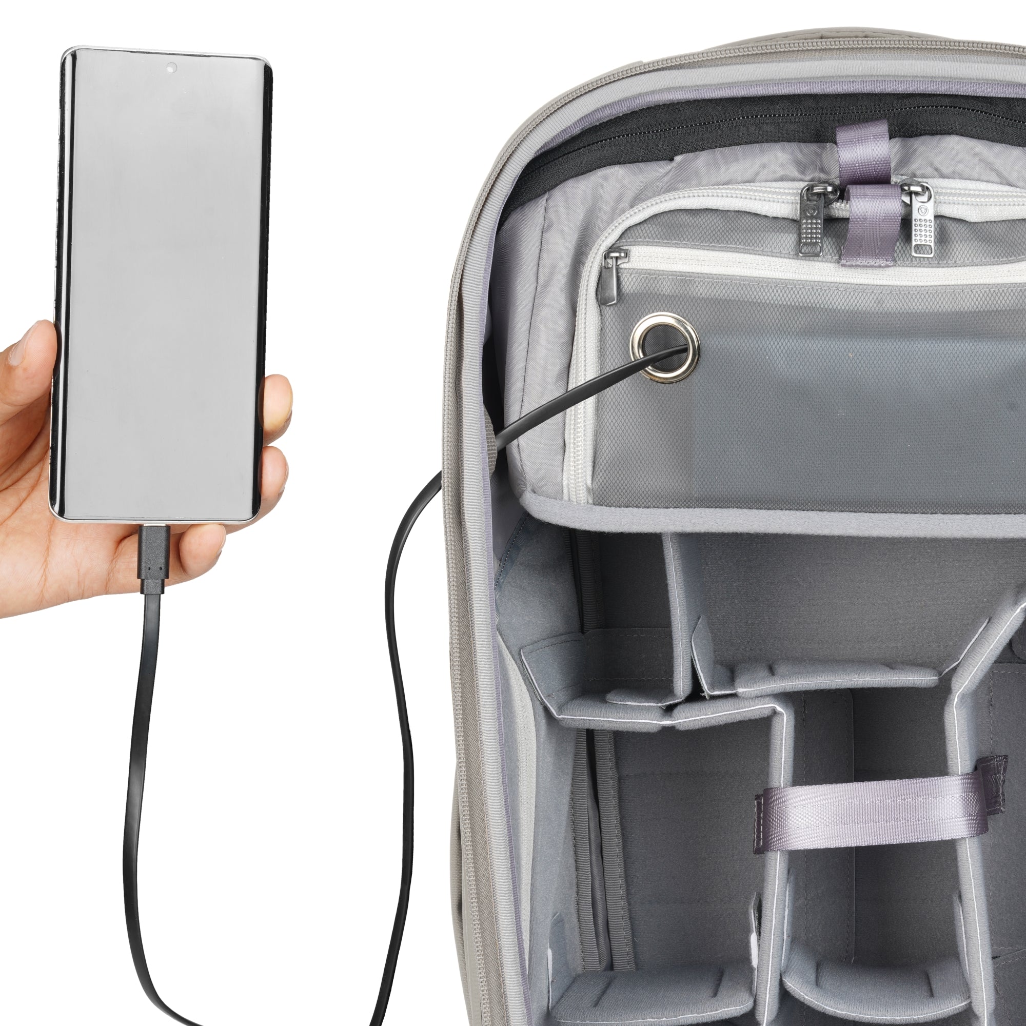 バッグの外側にはUSBケーブルスロットが配置されており、モバイルバッテリーを内部に収納したままスマホやタブレットの充電が可能。さらに、三脚やジャケットを固定できるストラップを装備しているため、アウトドアや旅行先でも荷物をまとめやすくなっています。サイドのボトルポケットには飲み物を入れられ、必要な時にサッと取り出せるので、撮影や移動の合間に素早く水分補給ができます。