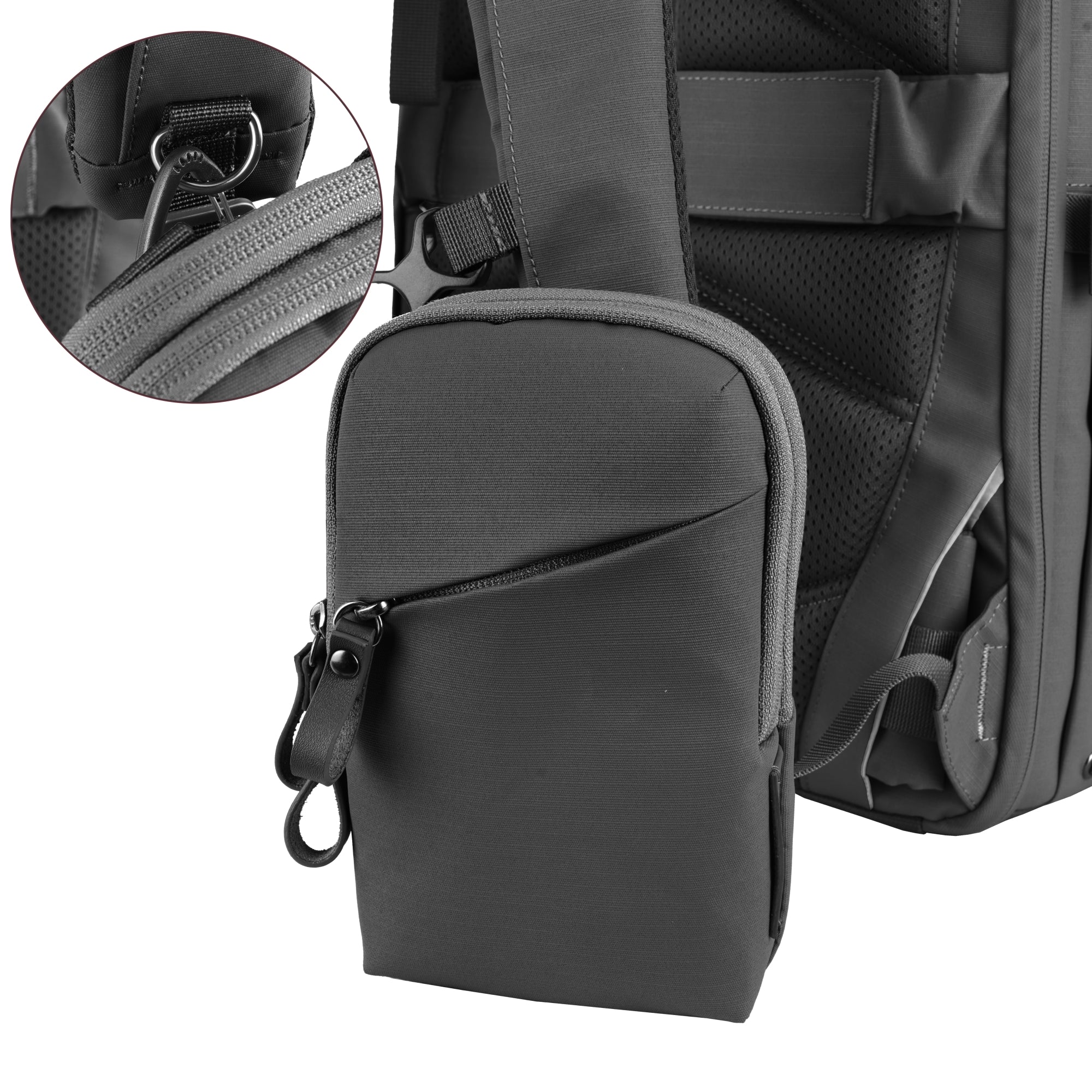 着脱可能なショルダーストラップとリアループを備え、用途やシーンに応じて自在に持ち運びが可能。ショルダーバッグとして肩掛けで使用できるほか、リアループを活用すればベルトやバッグに固定でき、移動中も安定した状態で持ち運べます。